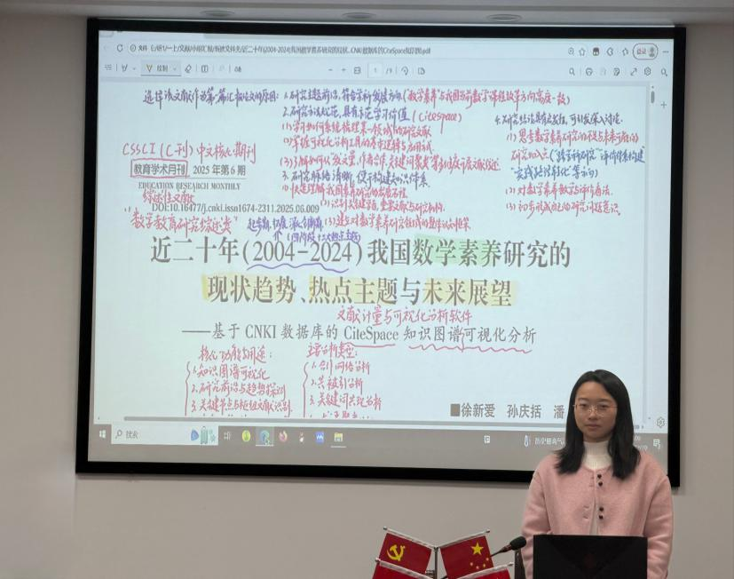 本次分享会由2025级研究生李晓晓作主题汇报。她以近二十年我国数学素养研究的发展脉络为主线,系统分享了一篇题为《近二十年(2004-2024)我国数学素养研究的现状趋势、热点主题与未来展望——基于CNKI数据库的CiteSpace知识图谱可视化分析》的论文。该研究依托CNKI数据库,运用CiteSpace知识图谱可视化方法,从发文趋势、作者合作、关键词聚类等多个维度,深入剖析了我国数学素养领域的研究动态、热点主题与前沿方向。