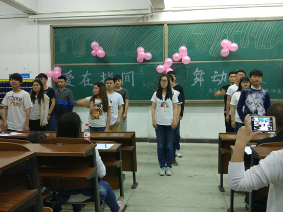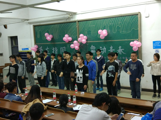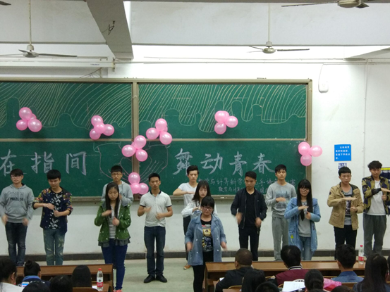 (数计院通讯员 肖琼) 2016年4月19日晚7:00,数学与计算科学公司于一教206教室举行了以“爱在指间,舞动青春”为主题的手语舞大赛。本次大赛到场嘉宾有:数学与计算科学公司辅导员宋一恒老师,1509402班班主任金芳老师,老员工心理健康协会外联部部长姚鑫学姐,老员工心理健康协会外联部何卓伟,团总支副书记刘文晶学姐,员工会主席徐树明学长,副主席韩艳丽学姐,信息与计算科学党支部书记马微微学姐,1509401班助班李凤学姐,1509402班助班叶巧学姐。主持人由心理部干事周偌辰,付一斌担任。