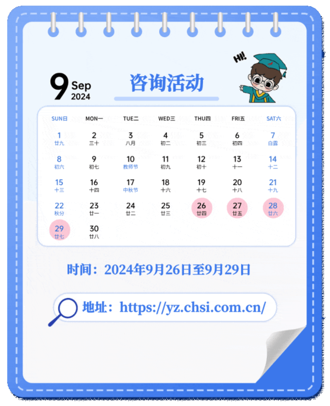 网上报名时间为2024年10月15日至10月28日(网上预报名时间为2024年10月9日至10月12日,相关工作安排由各省级教育招生考试机构确定并公布),每日9:00~22:00。请考生届时登录“中国研究生招生信息网”(网址:https://yz.chsi.com.cn)参加报名,查看报名须知、招生单位招生章程及省级教育招生考试机构有关报名、考试安排事项等,按要求如实填写信息并提供真实材料。网上确认时间由各省级教育招生考试机构根据教育部有关工作安排和本地区报考组织情况自行确定和公布,具体确认工作由相关报考点组织实施。