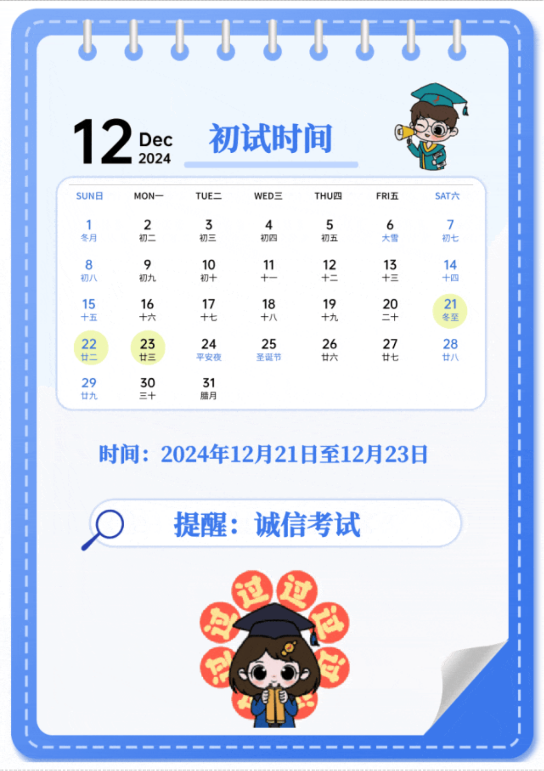 2025年全国硕士研究生招生初试时间为2024年12月21日至22日,考试时长为6小时的考试科目在12月23日举行。